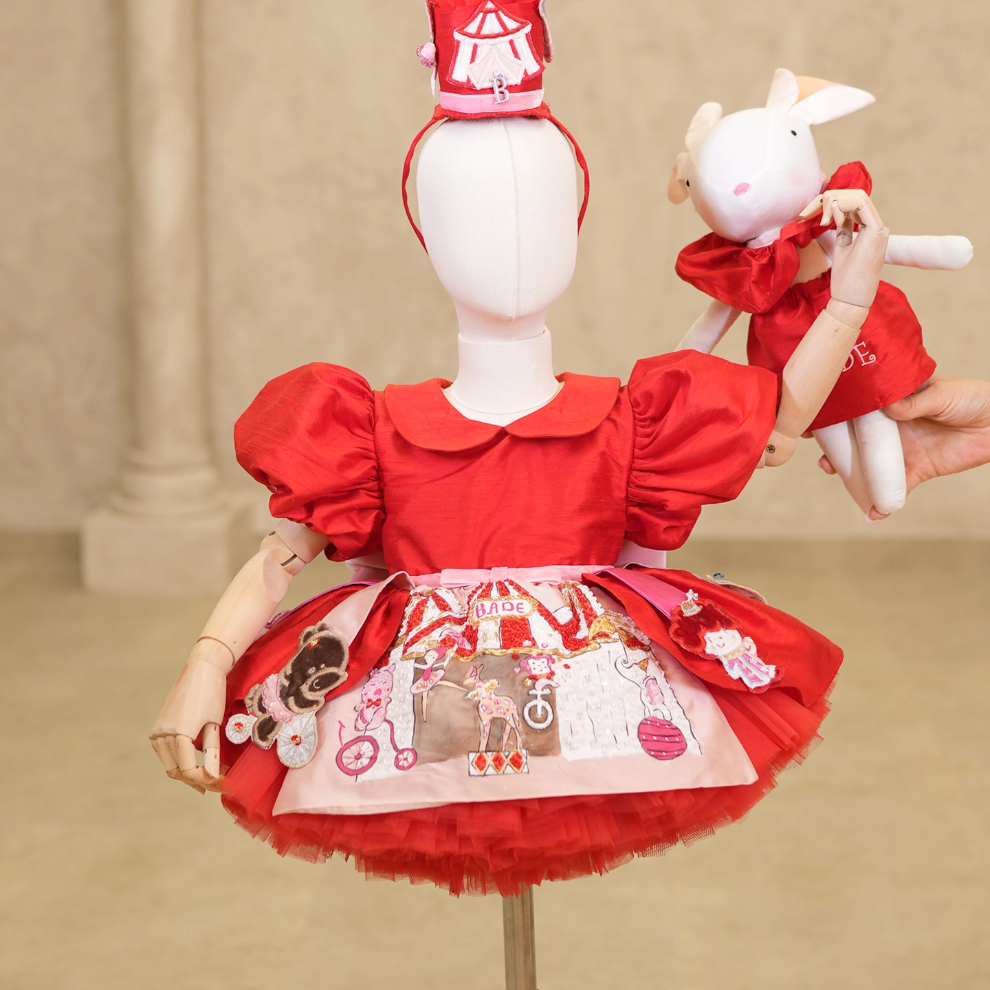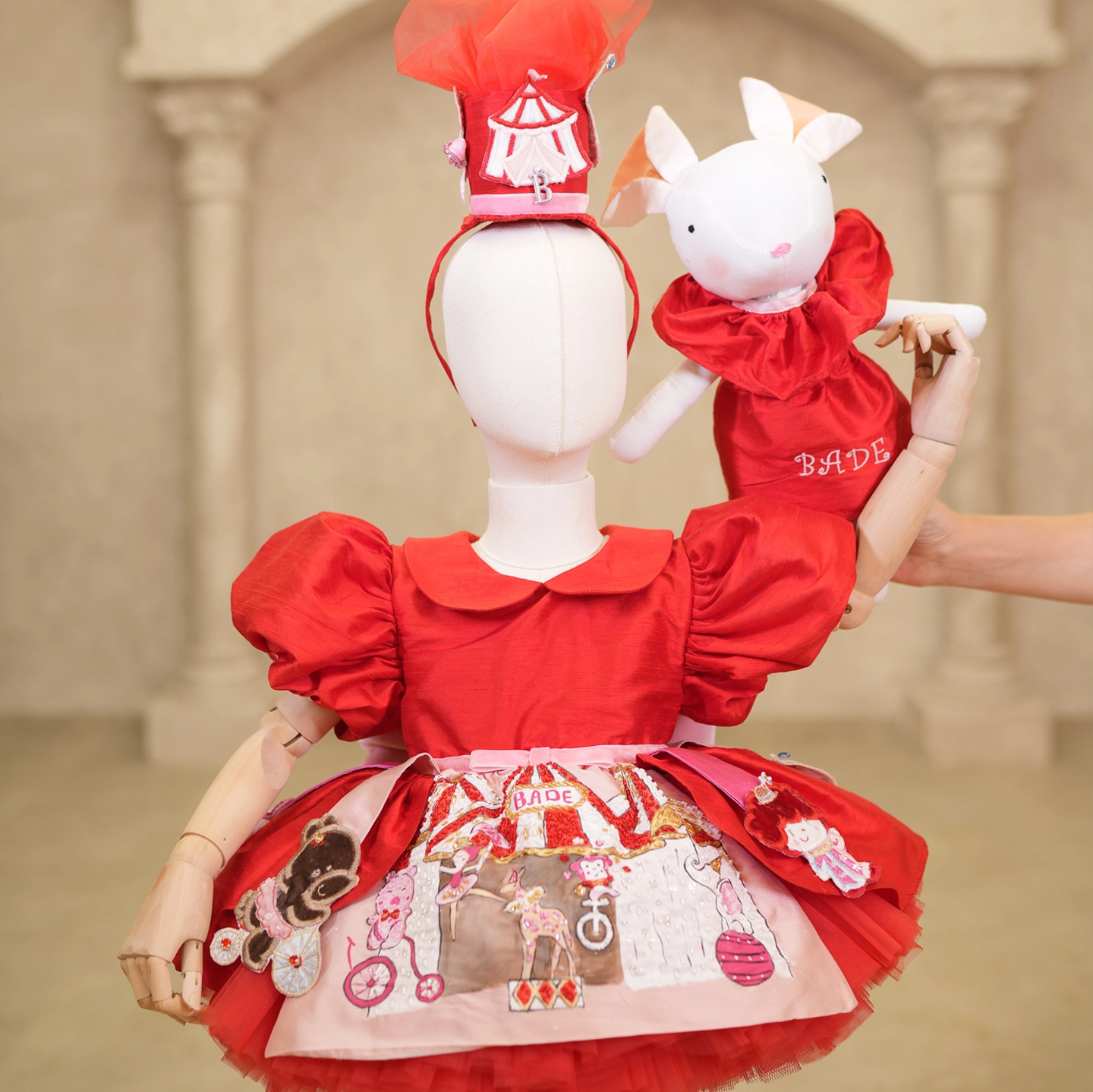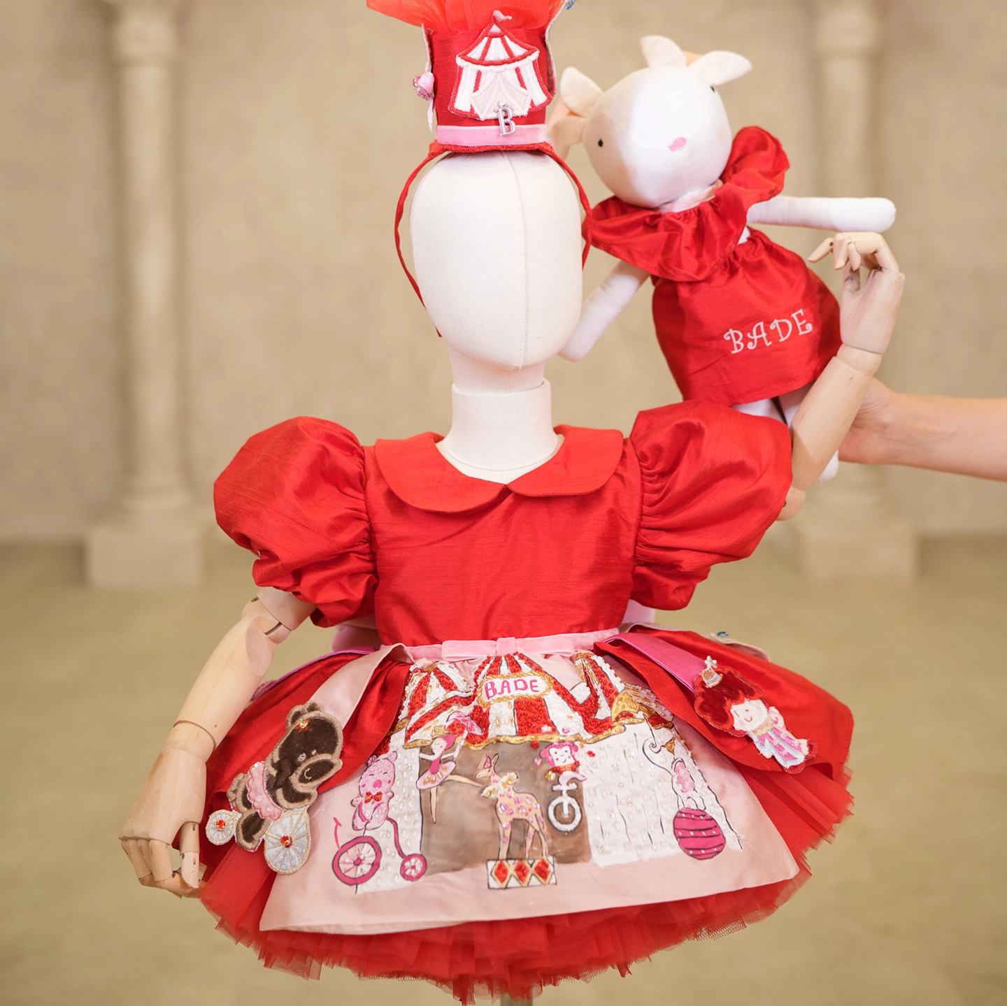 Featuring individually crafted macarons on the chest and a sweet mouse detail emerging from a cup on the hem, this is one of the most charming designs in our collection. The elegant softness of the salmon tone is complemented by a silk bow placed at the waist.