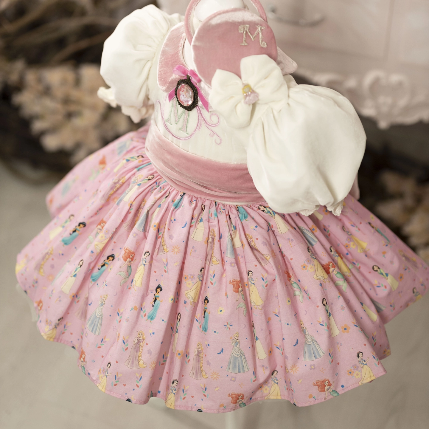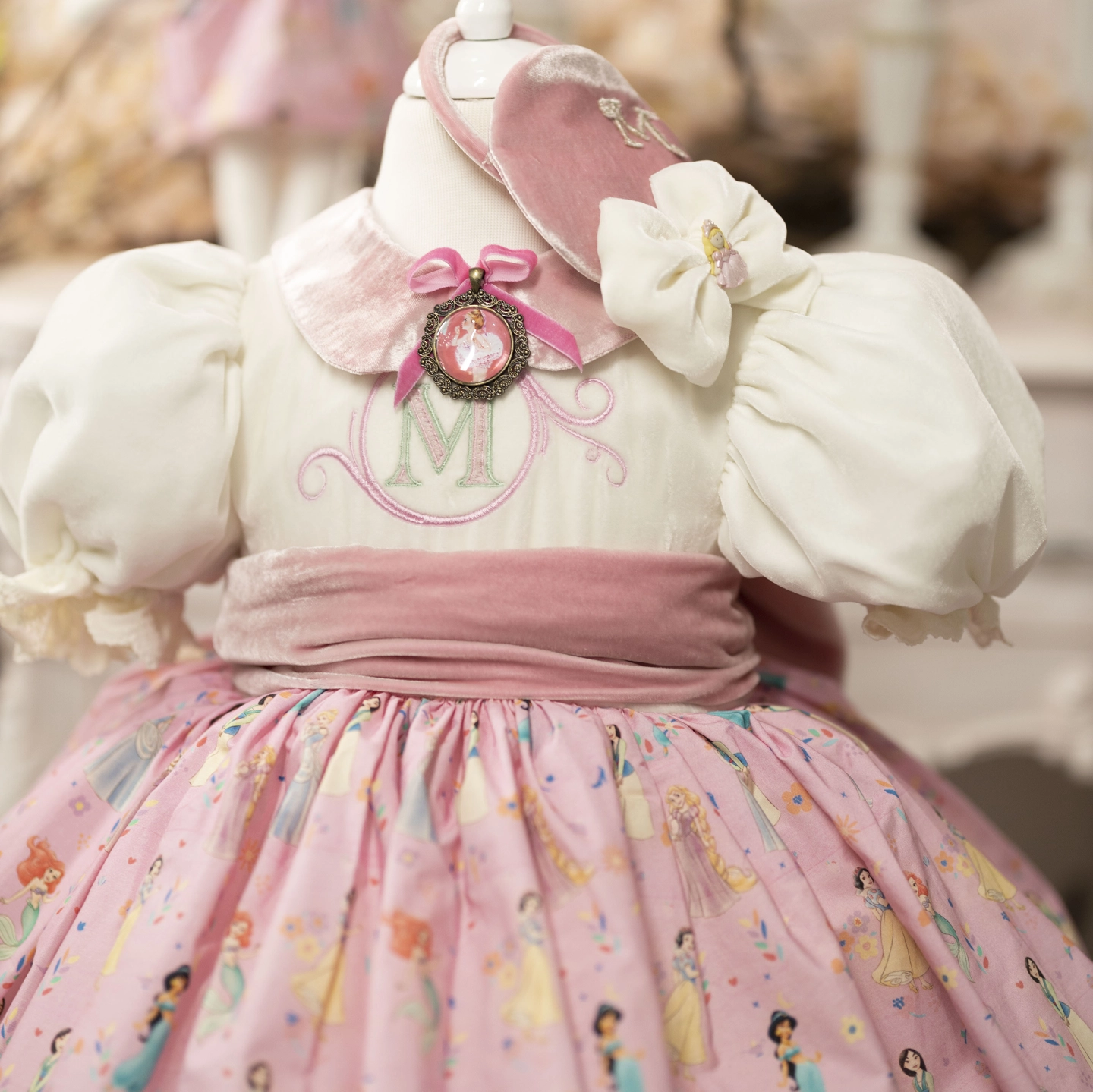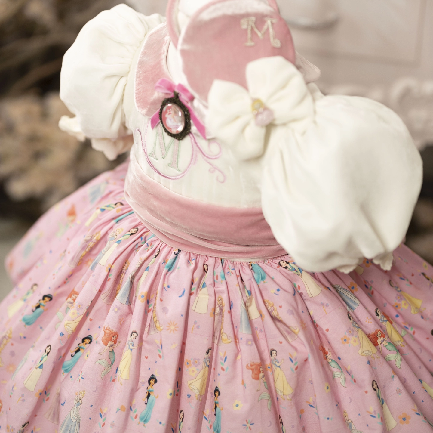 Disney princesses dance gracefully on the soft cotton skirt, while the silk bodice and silk sash give the dress an elegant look. The removable brooch adds a delicate finishing touch to the design.