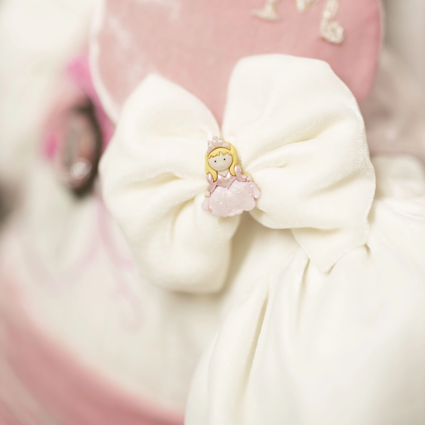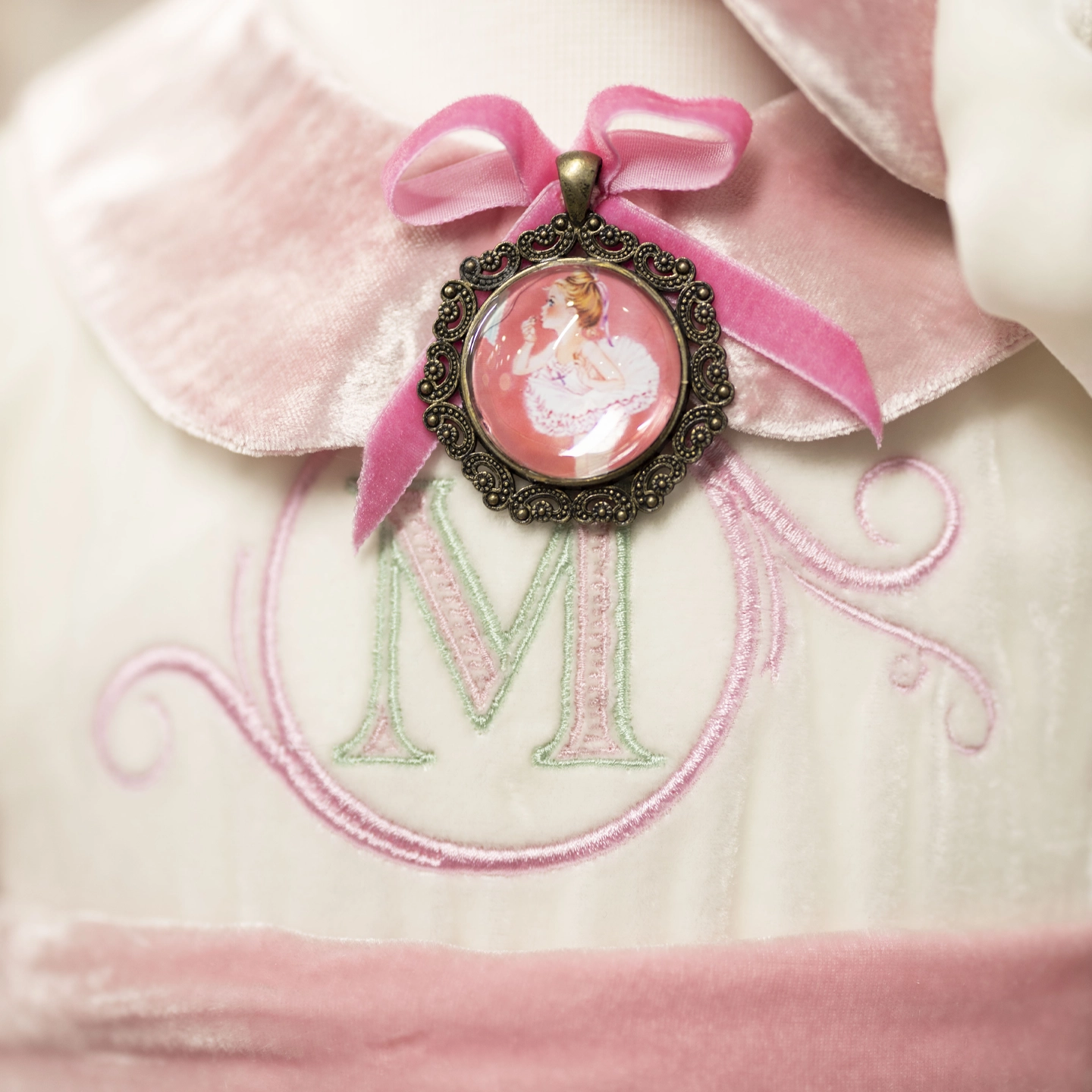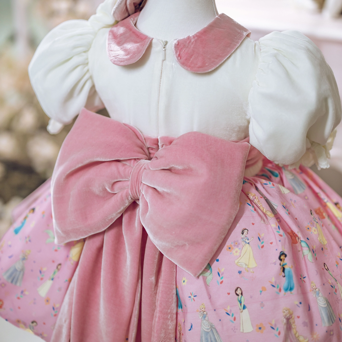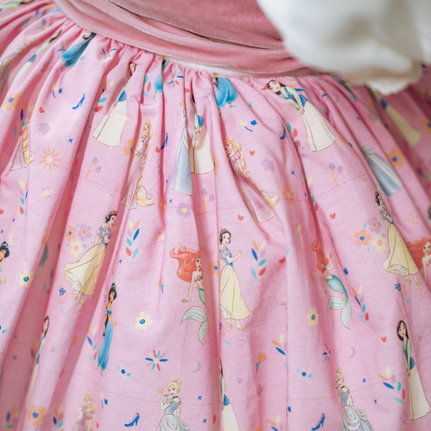 Disney princesses dance gracefully on the soft cotton skirt, while the silk bodice and silk sash give the dress an elegant look. The removable brooch adds a delicate finishing touch to the design.