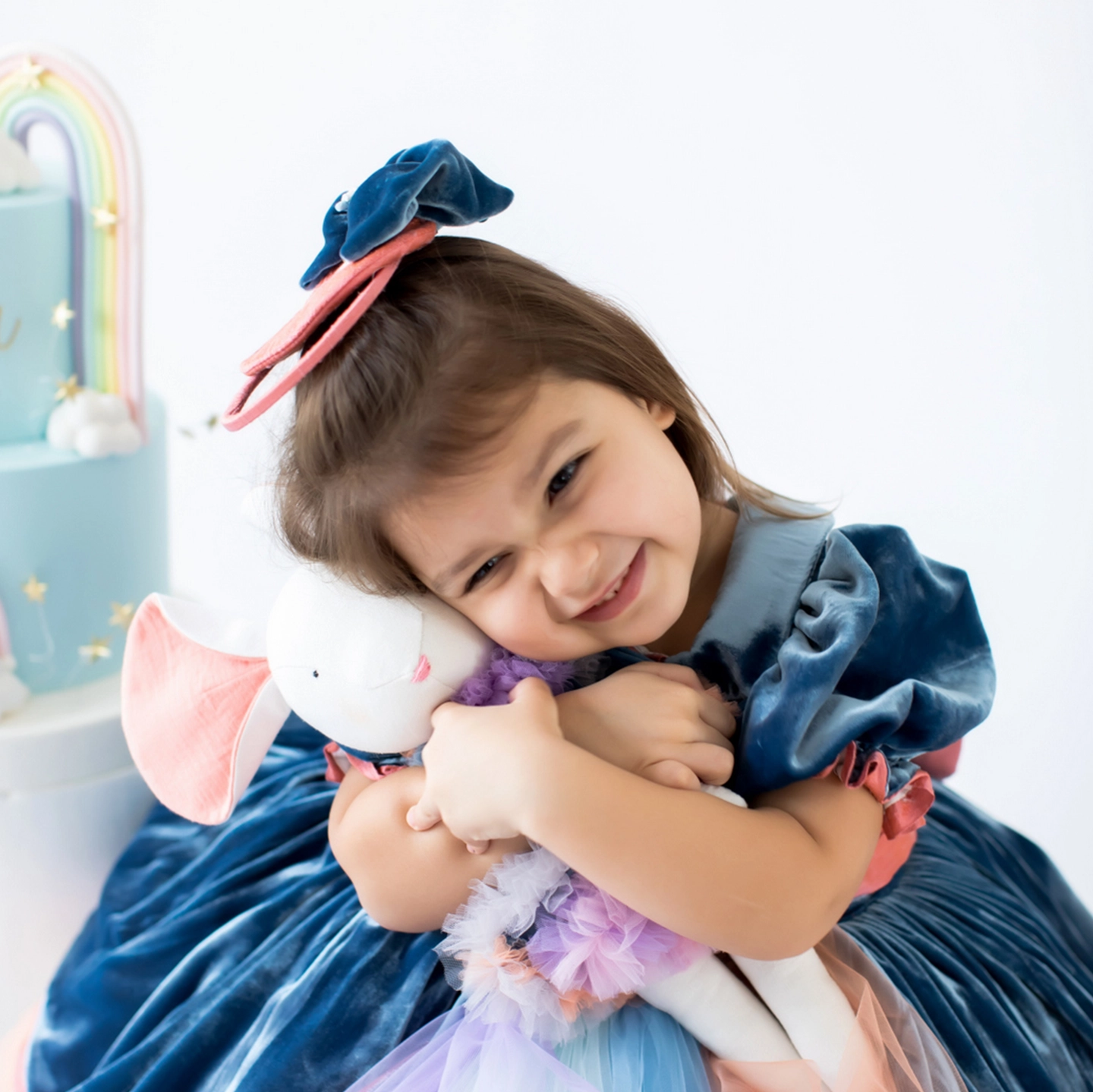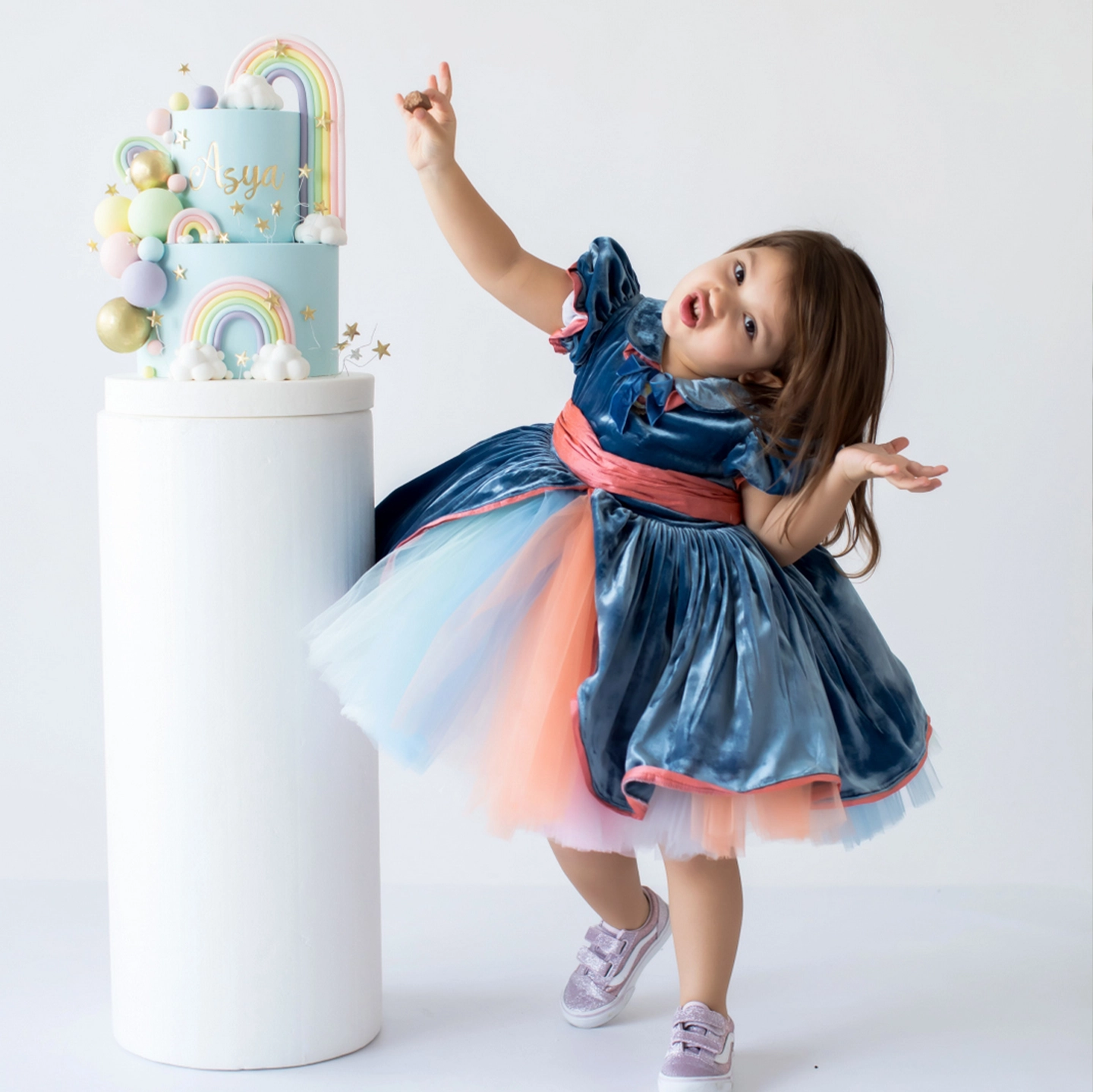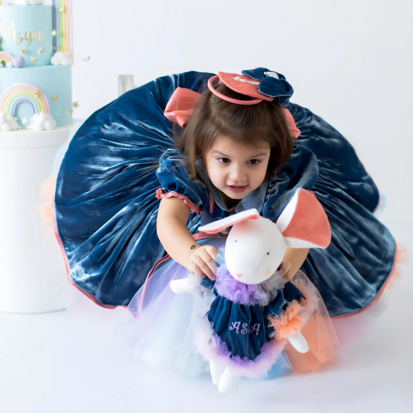 The colorful tulle emerging from the center of the voluminous skirt of this dress, made entirely of silk velvet, adds a fairy-tale and cheerful rainbow effect to the design.