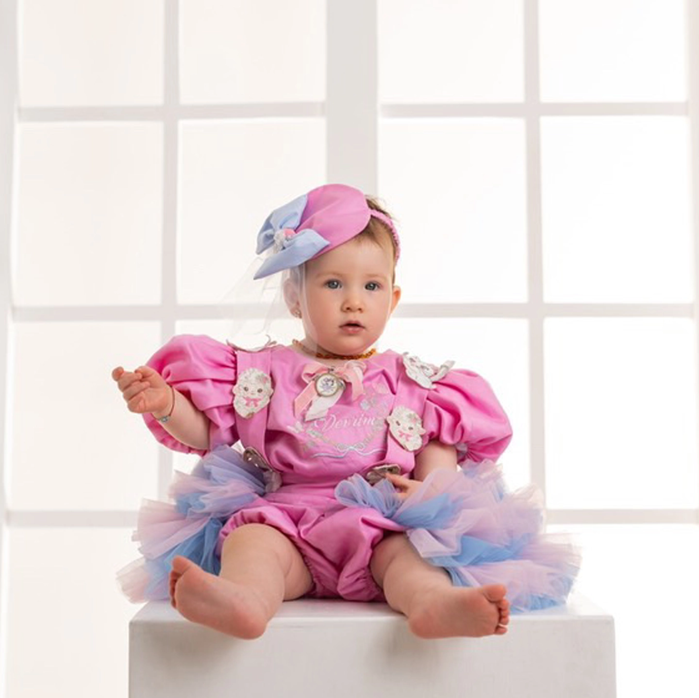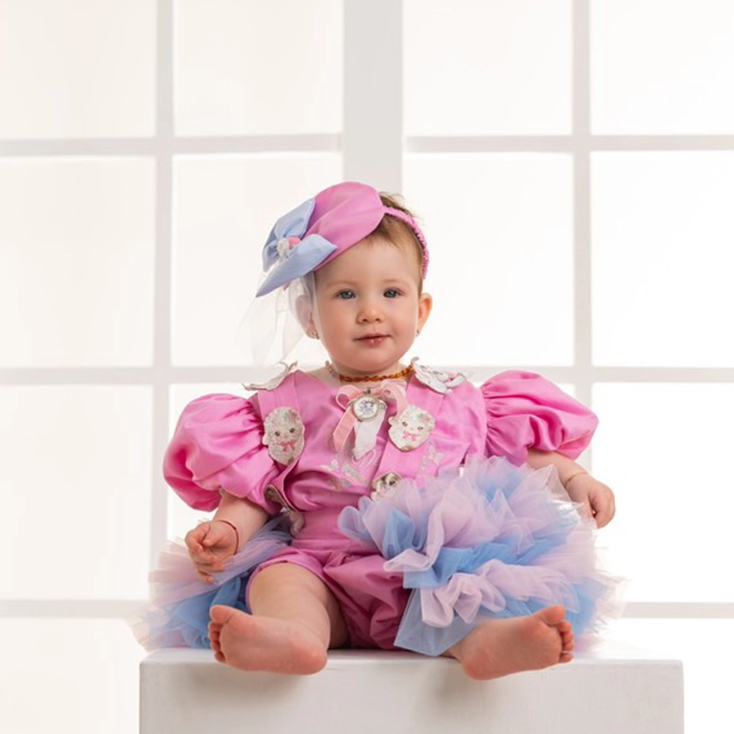 With its balloon sleeves and puffy tutu, this design gives little ladies an elegant look; it is completed with straps that can be embroidered as desired and a removable brooch.