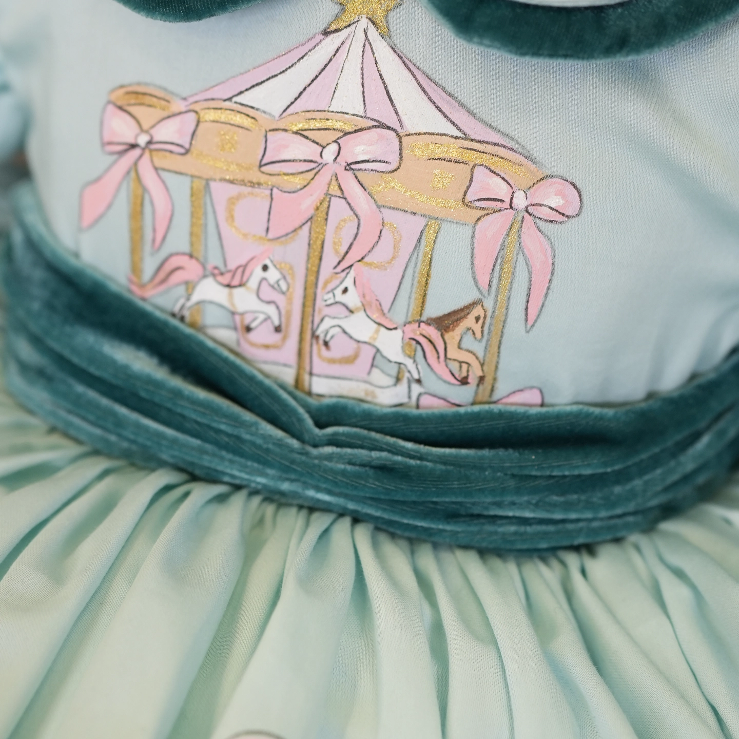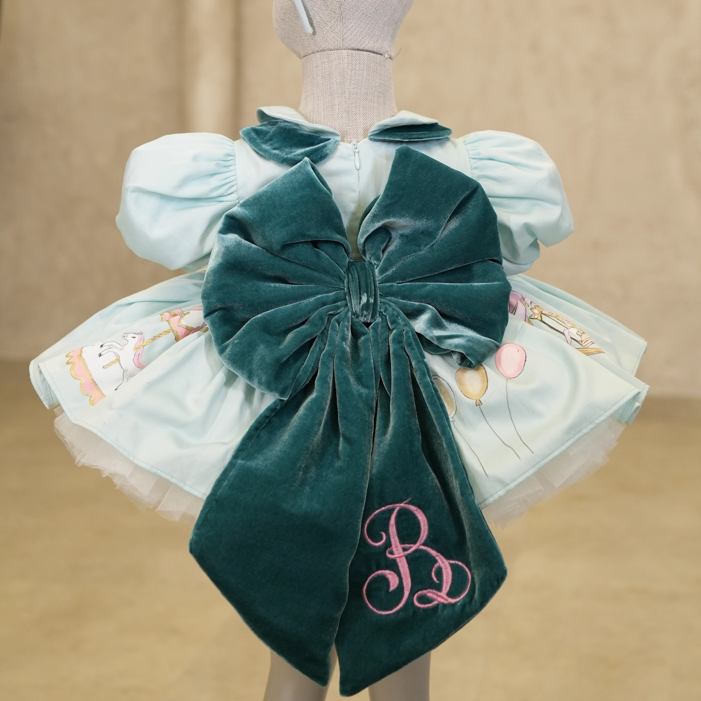 Dönüp duran bir masalın içindeymiş hissi veren bu model, el çizimi atlı karınca temasıyla tasarlandı. Beldeki ipek fiyonk ise tasarıma zarif bir tamamlayıcılık katıyor.• Elbise: %100 pamuk