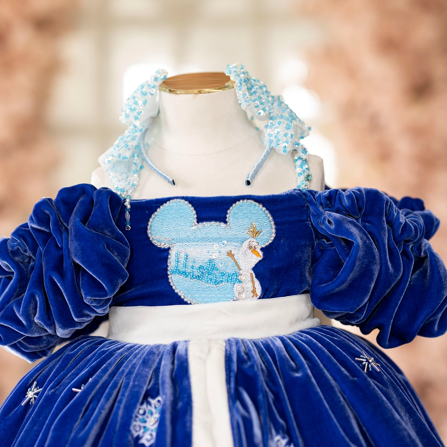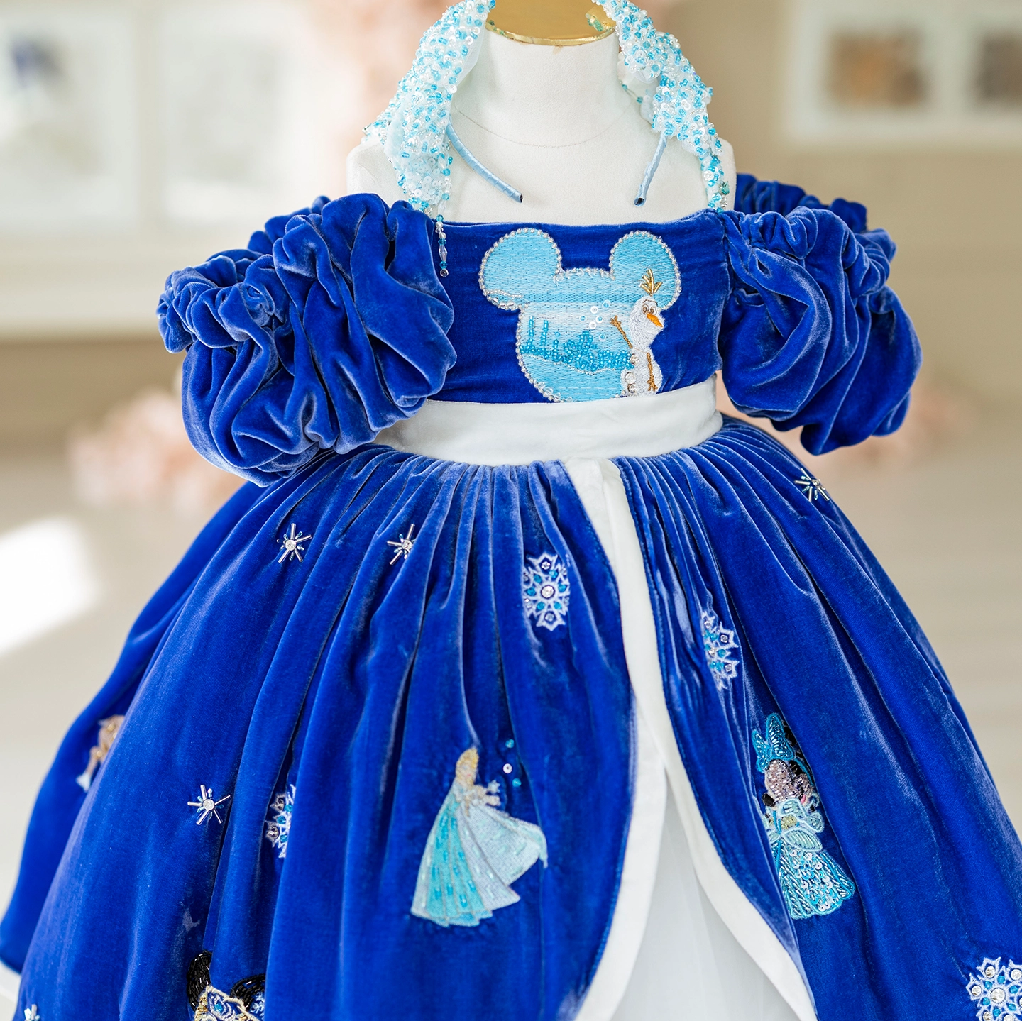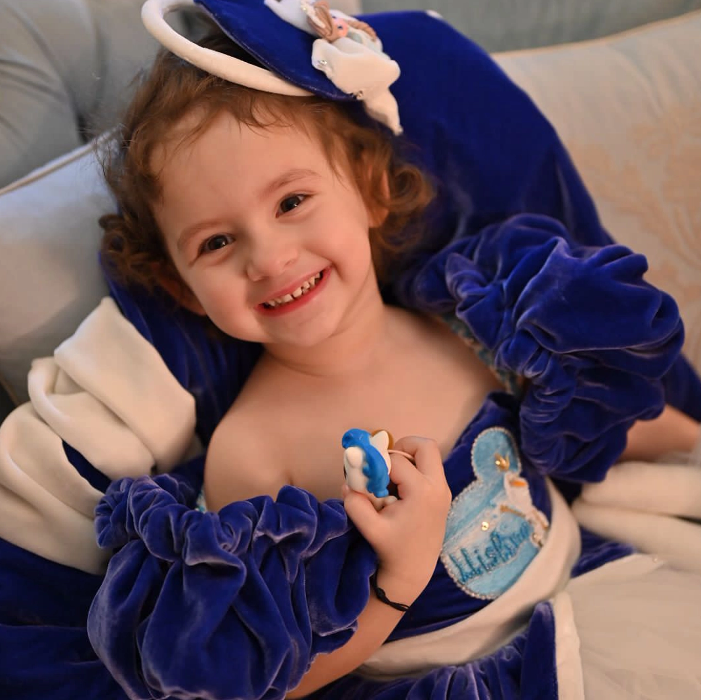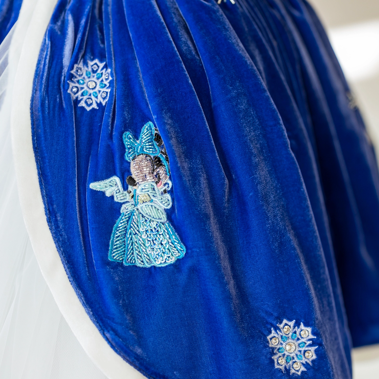 Elsa ve Mine’nin arkadaşlığından doğan bu elbise, derin lacivert ipeğin asaletiyle masalsı bir kış sahnesini çocukların üzerine taşır. Üzerindeki temalar el işçiliğiyle işlendi; içinden çıkan kat kat yumuşak tüller ise yürüdükçe bulut gibi kabarıp sahne etkisi yaratır.