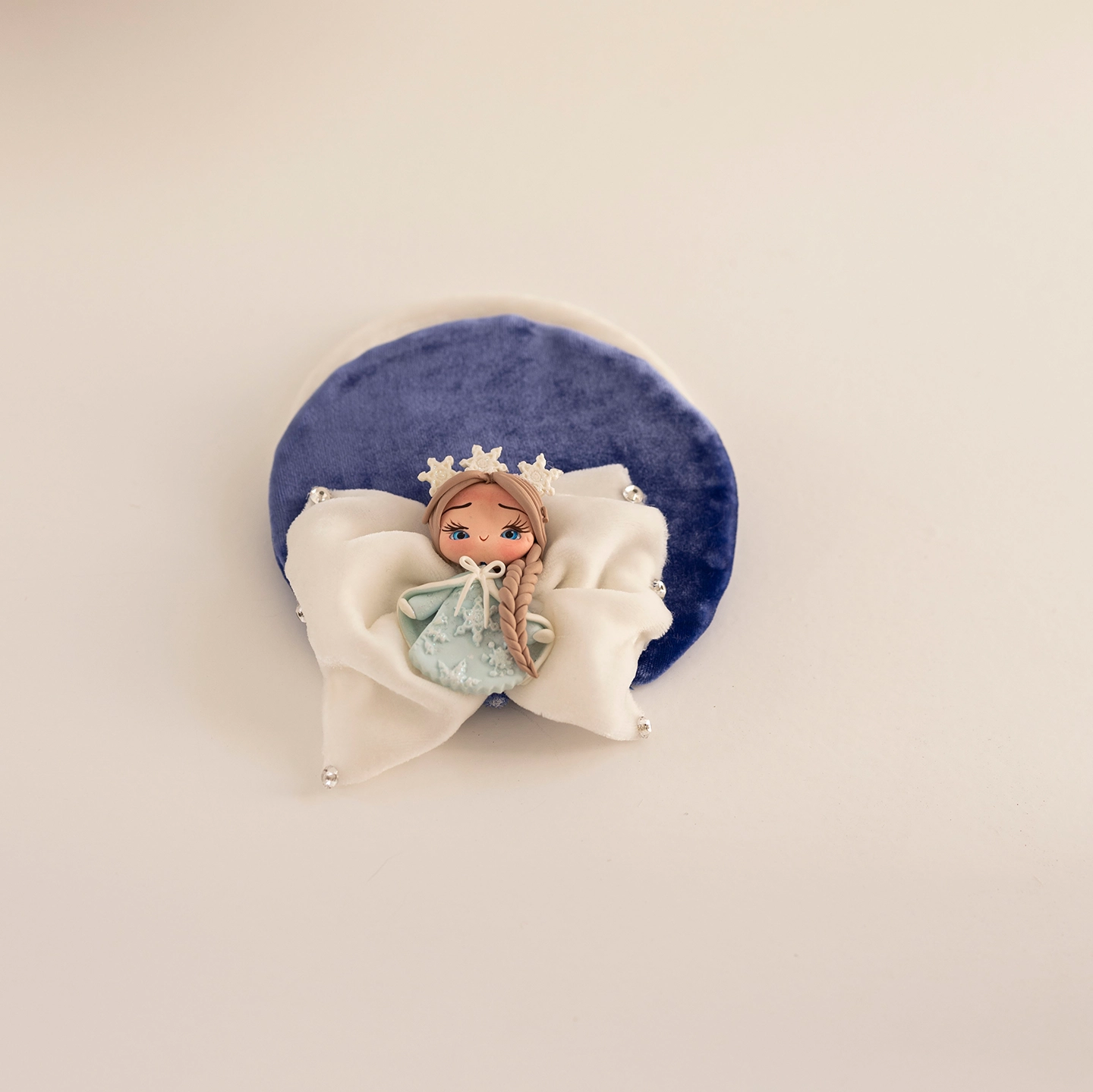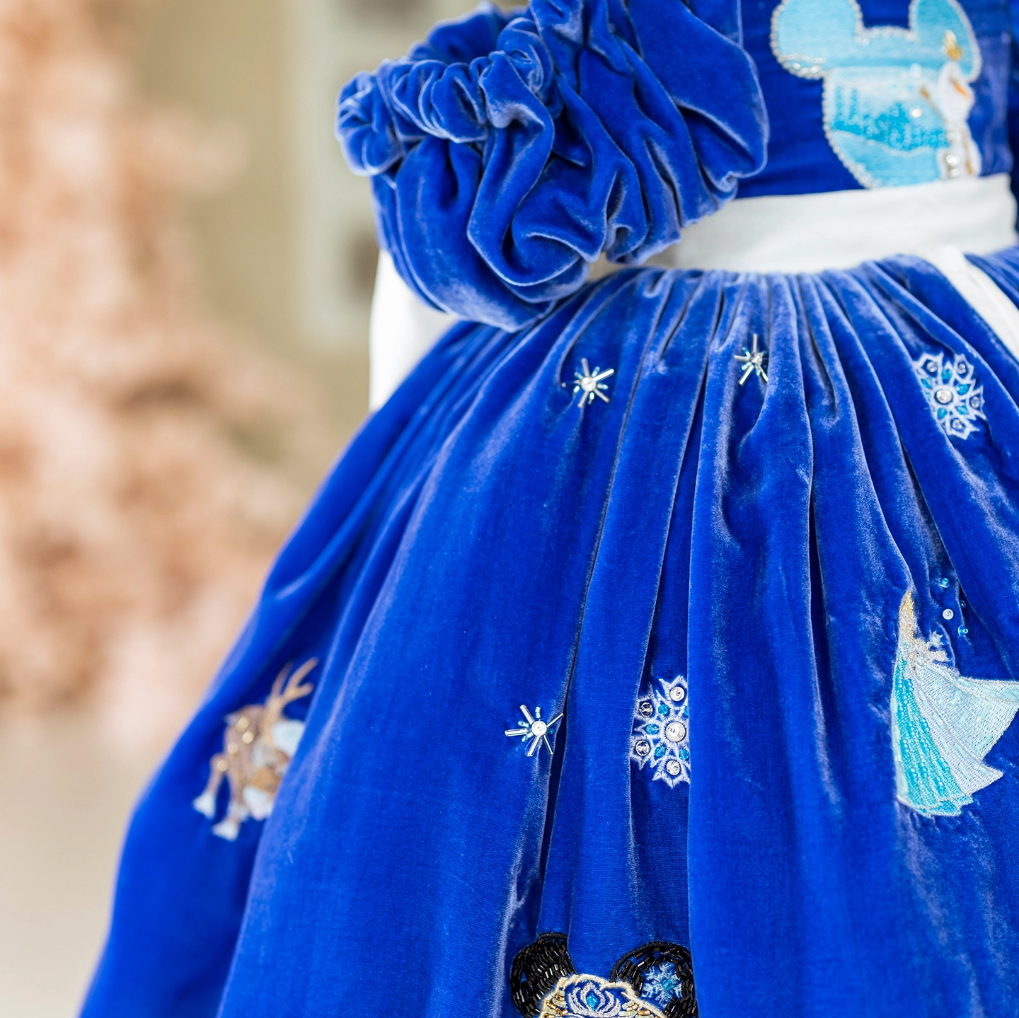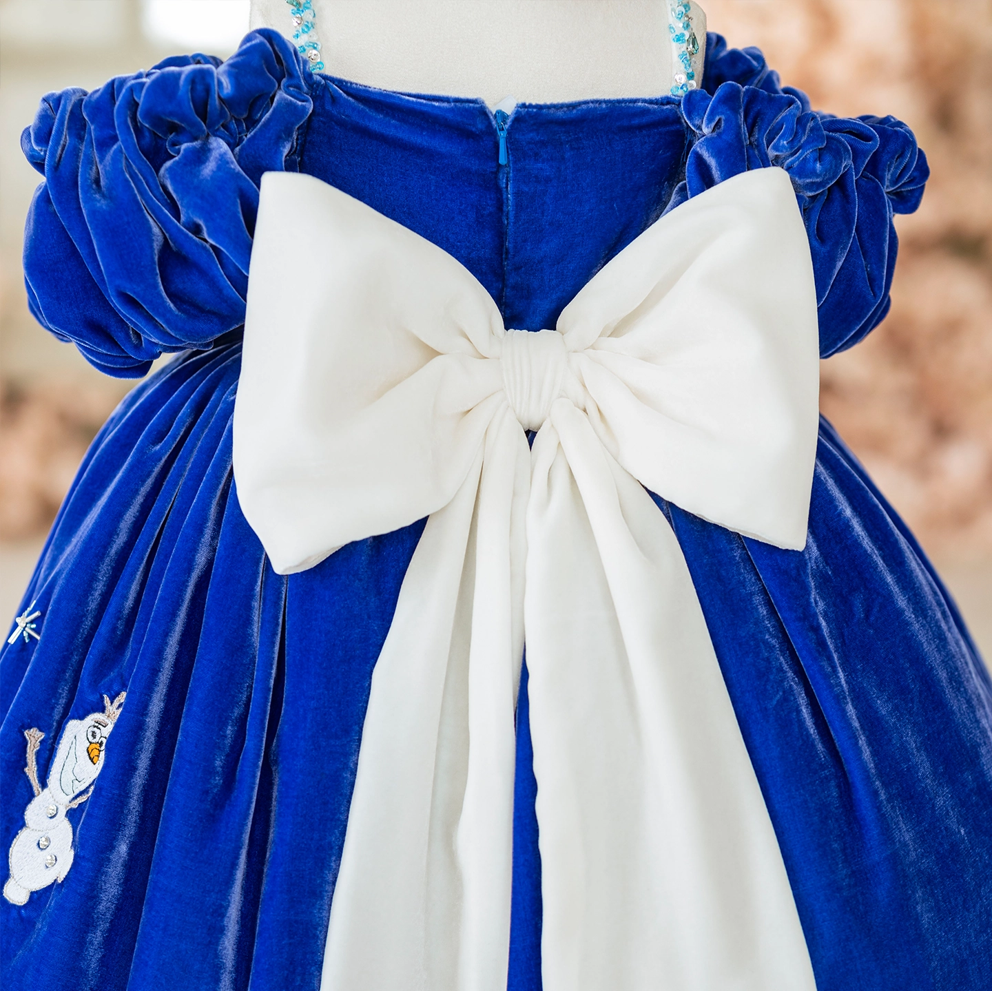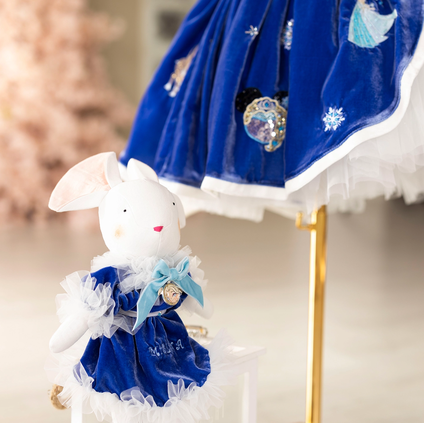Elsa ve Mine’nin arkadaşlığından doğan bu elbise, derin lacivert ipeğin asaletiyle masalsı bir kış sahnesini çocukların üzerine taşır. Üzerindeki temalar el işçiliğiyle işlendi; içinden çıkan kat kat yumuşak tüller ise yürüdükçe bulut gibi kabarıp sahne etkisi yaratır.