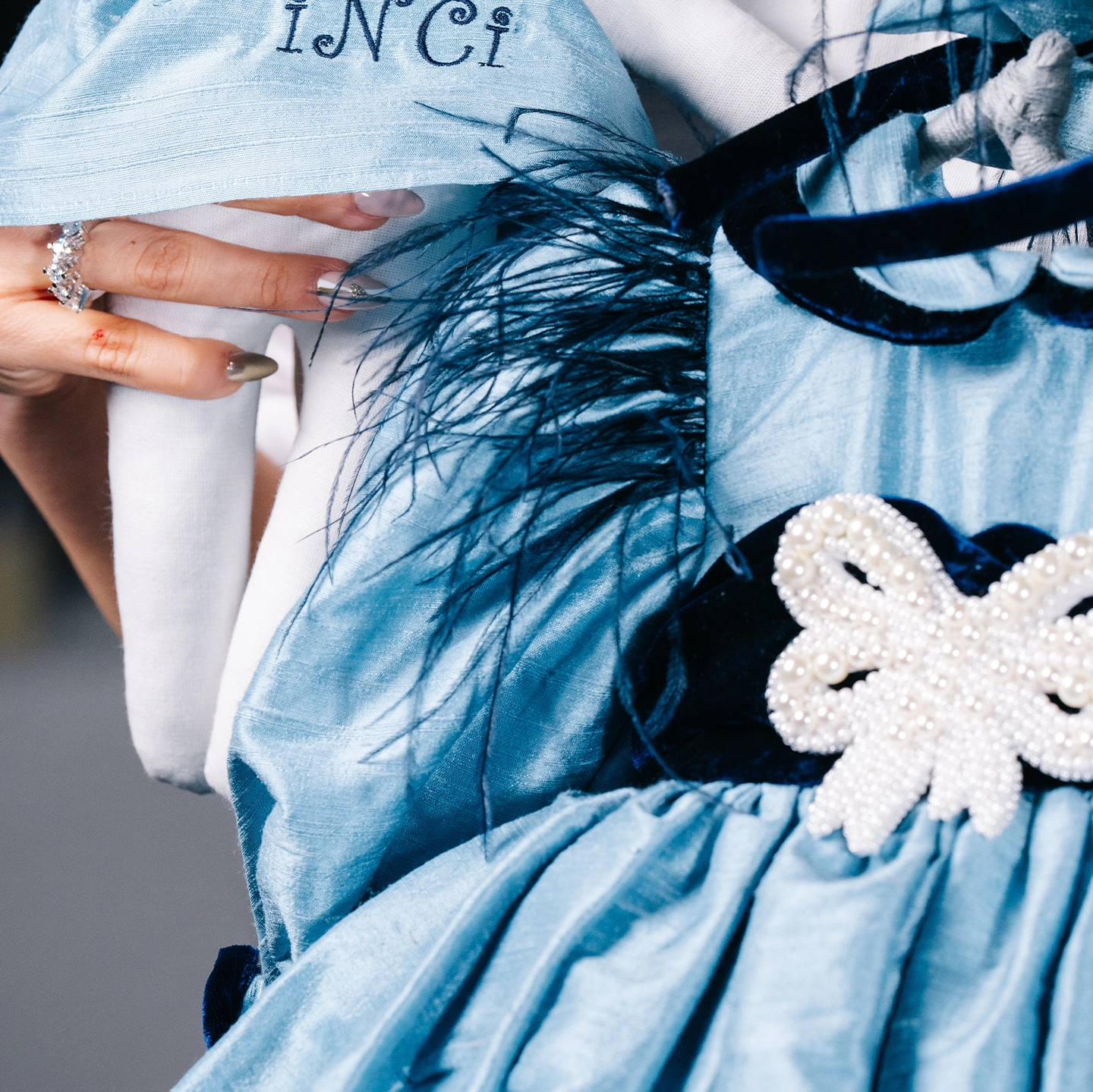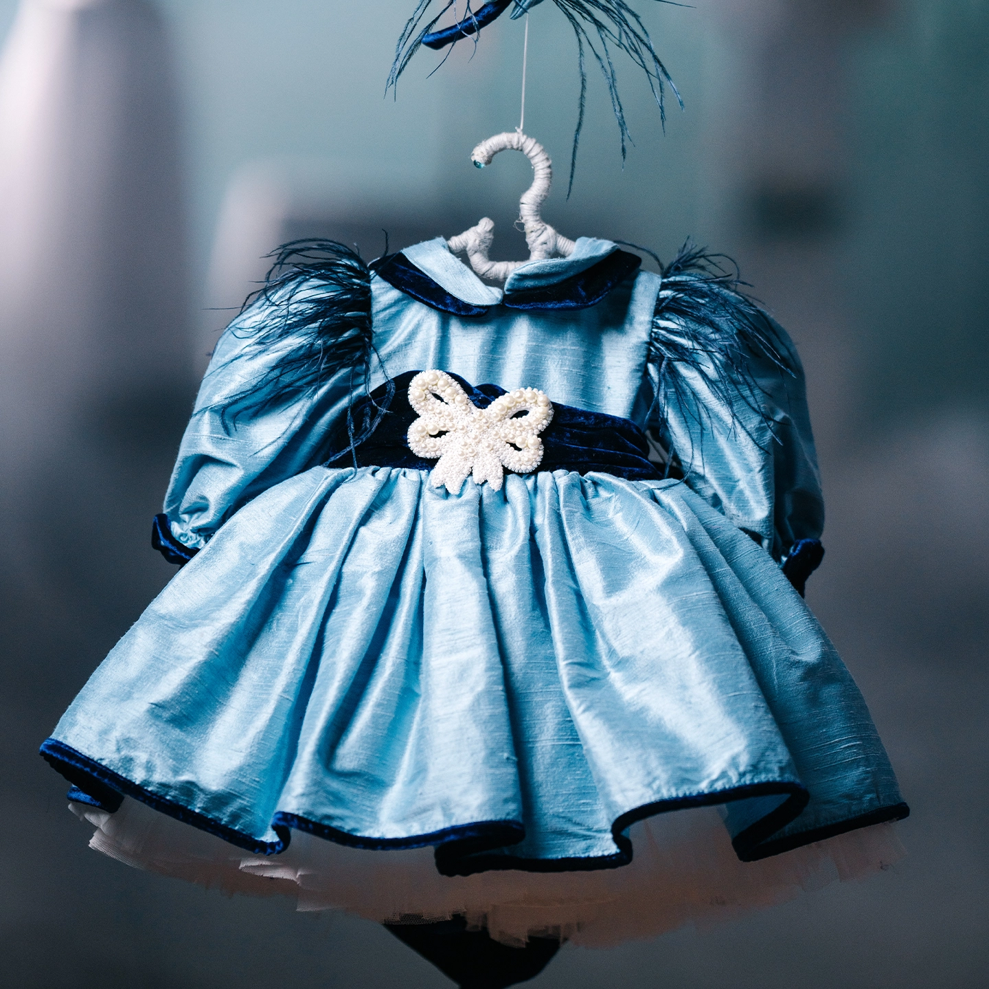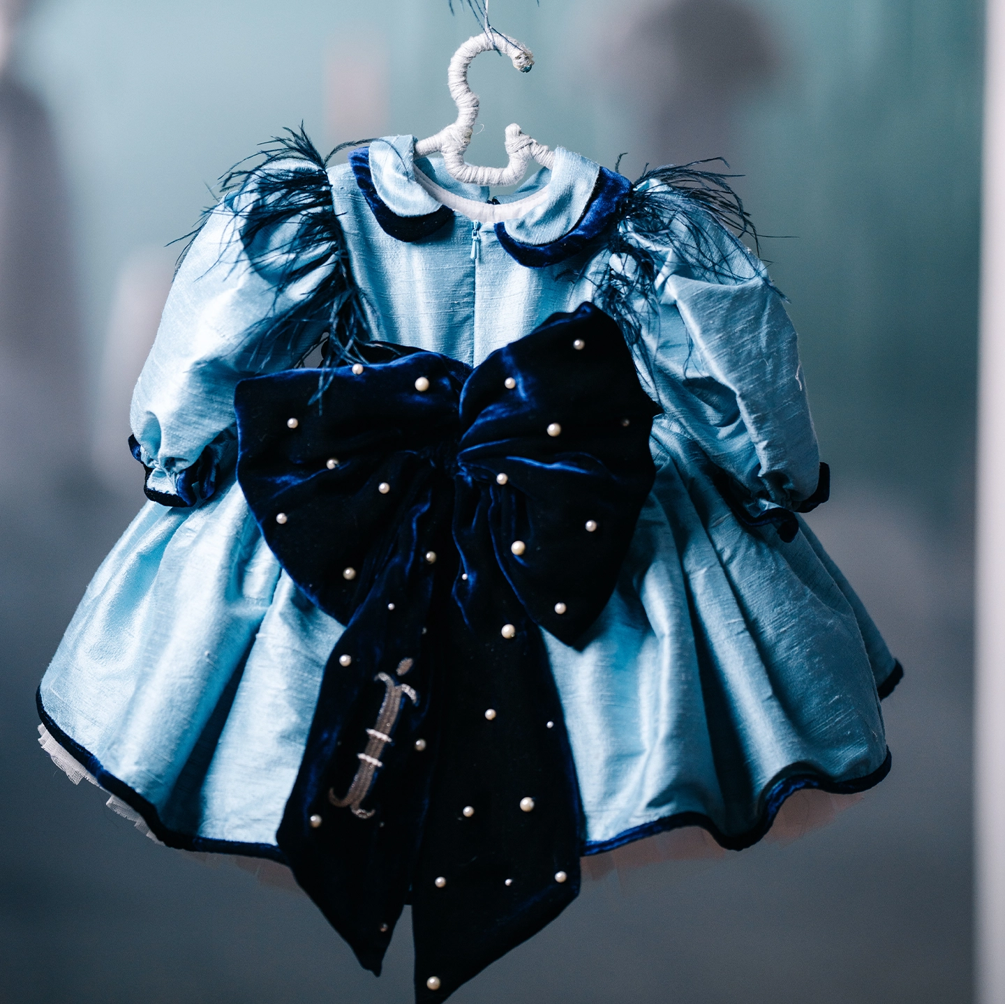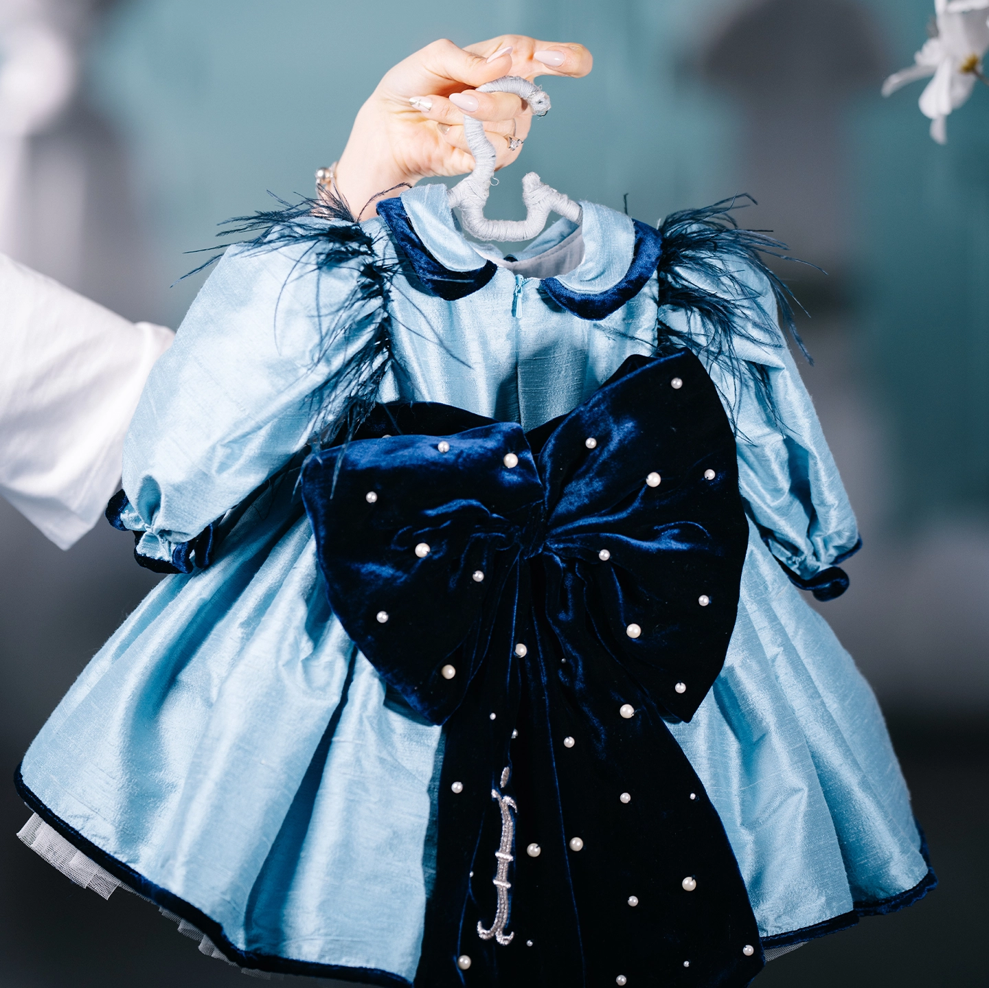 Tüy detaylı kabarık uzun kolları ve tam ipekten hazırlanan zarif formu ile “masal prensesi” silueti sunan bu elbise; beldeki %100 ipek fiyonk ve gerçek inci broş detayı sayesinde ismini taşıyan “Mavi İnci” hissini kusursuzca yansıtır.