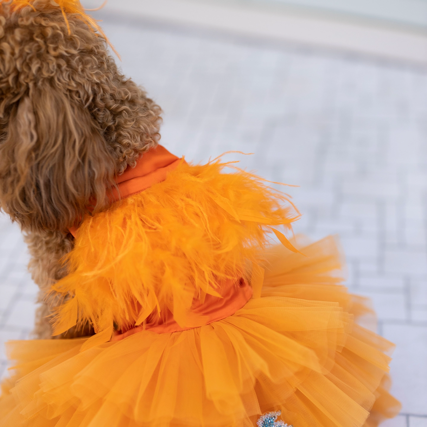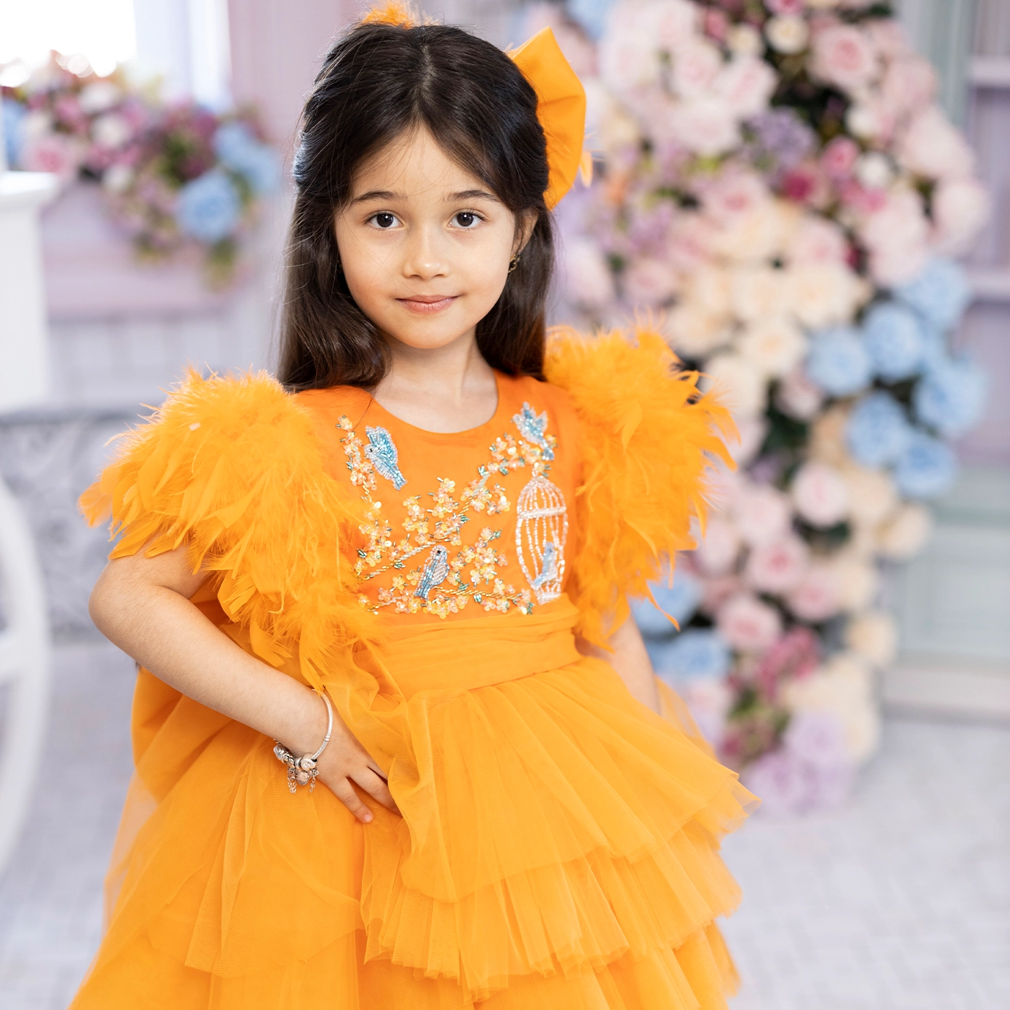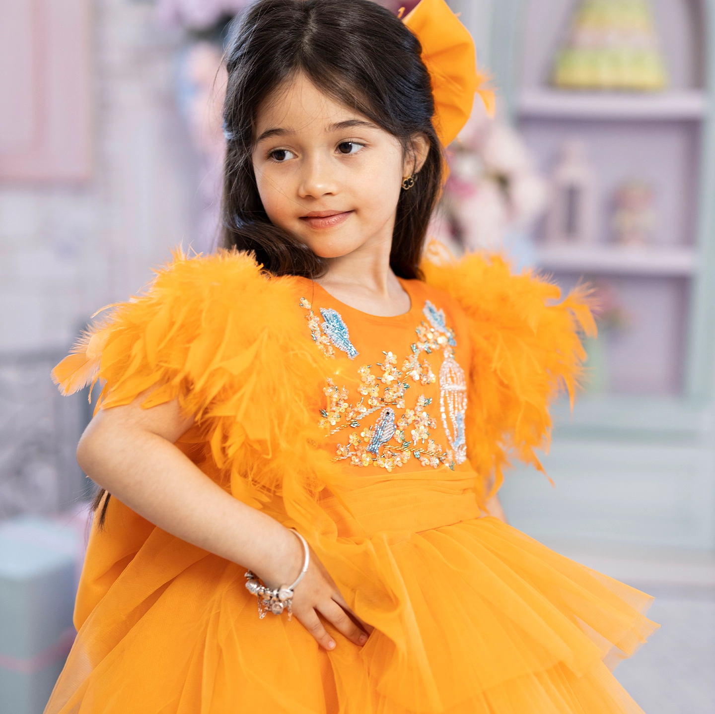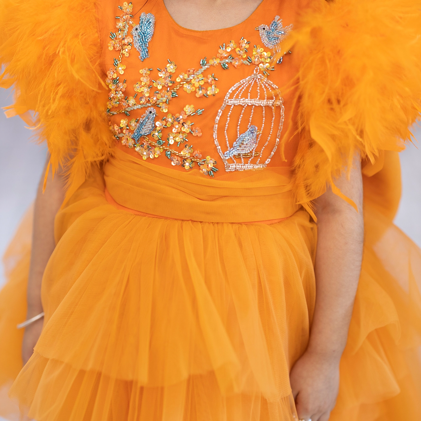 Önü kısa arkası uzun tasarlanan turuncu elbise, kat kat %100 ipek tül ile hacim kazanır. Üst bedende mavi kuşlar ve çiçekli kafesler, İtalyan kristalleri ve gerçek Swarovski taşlarla işlendi. Kollarda gerçek kuş tüyleri kullanıldı. İç astar %100 pamuk, alt etek ise formunu koruyan yırtılmaz tül ile güçlendirildi.