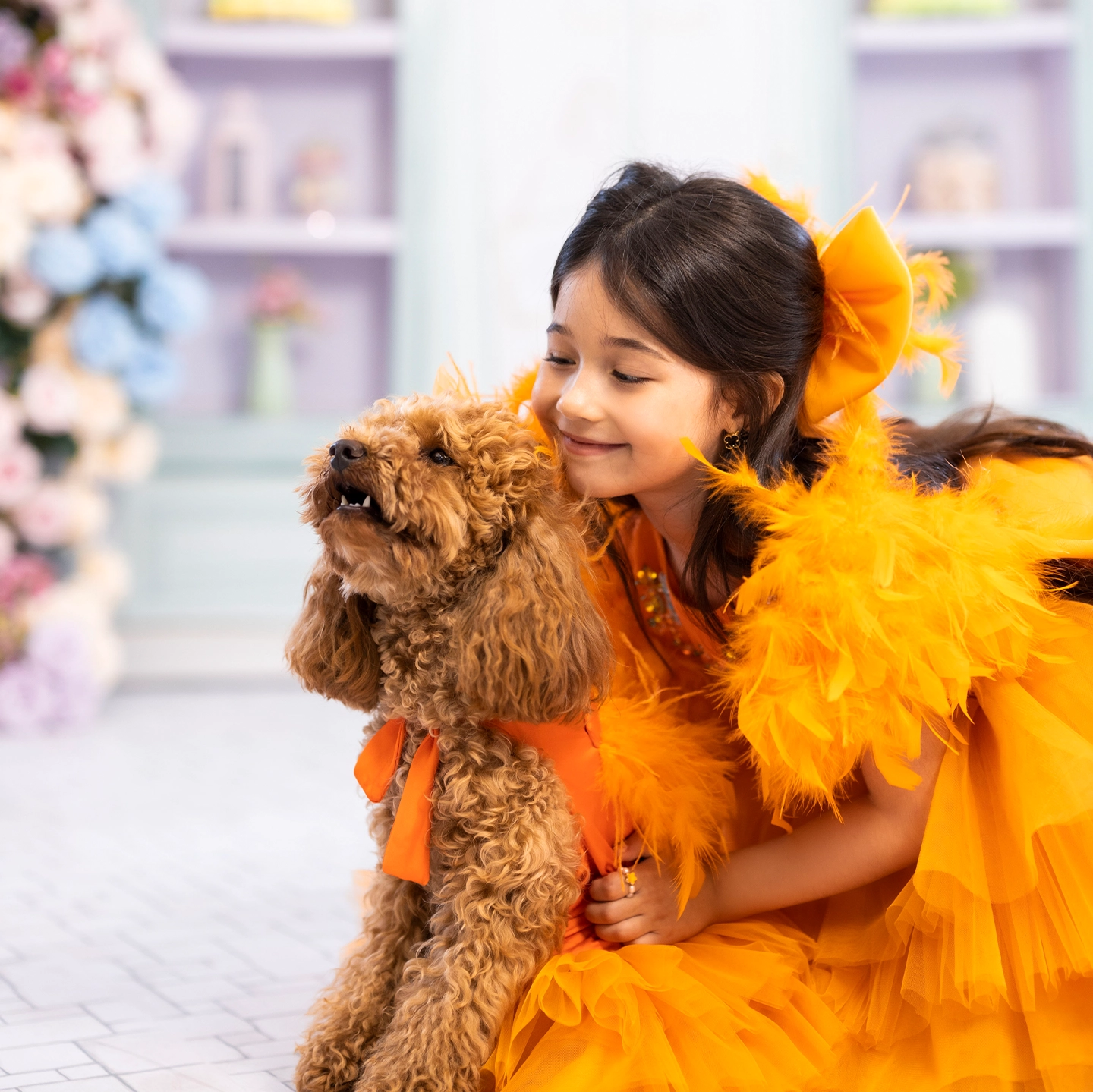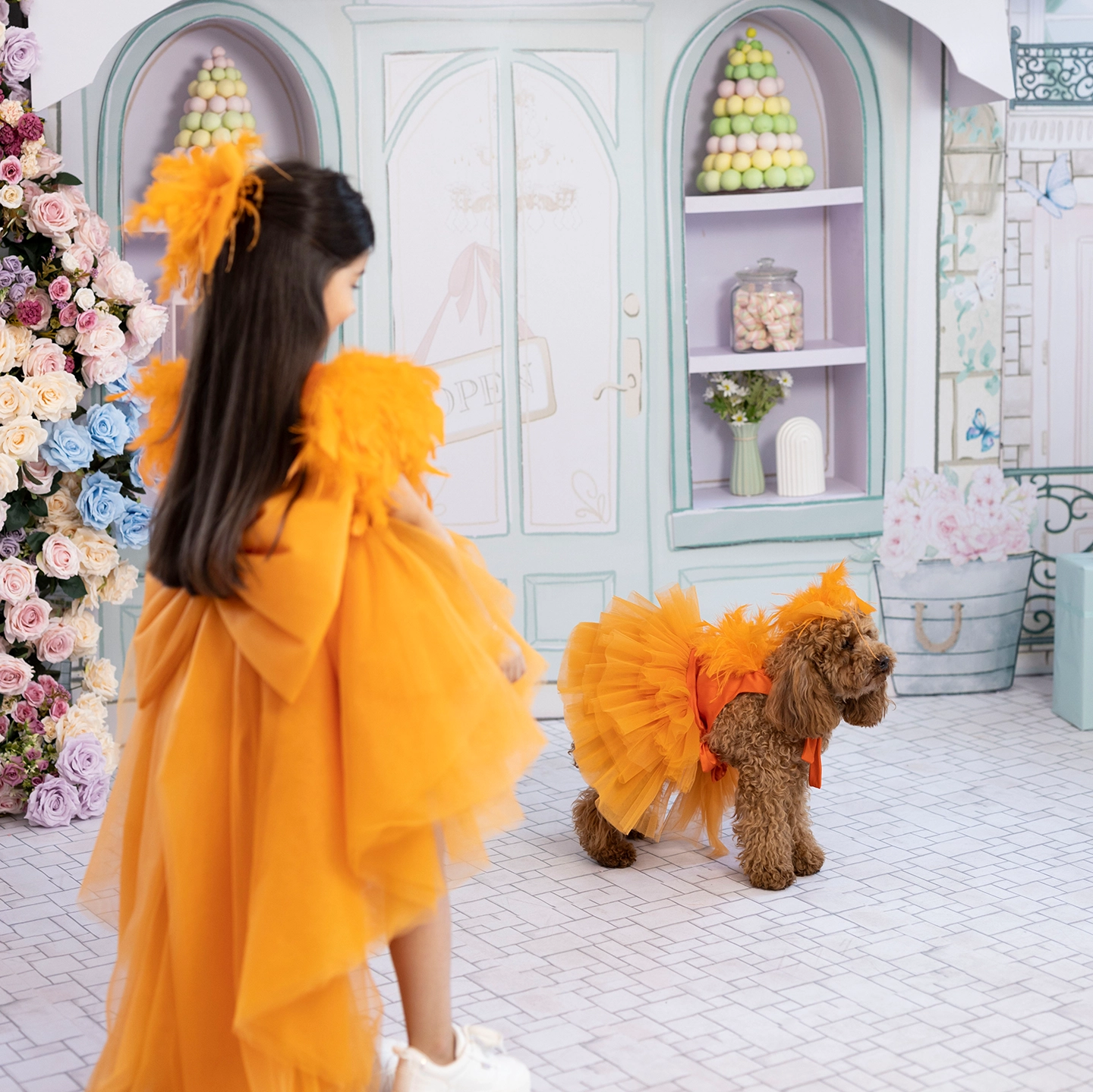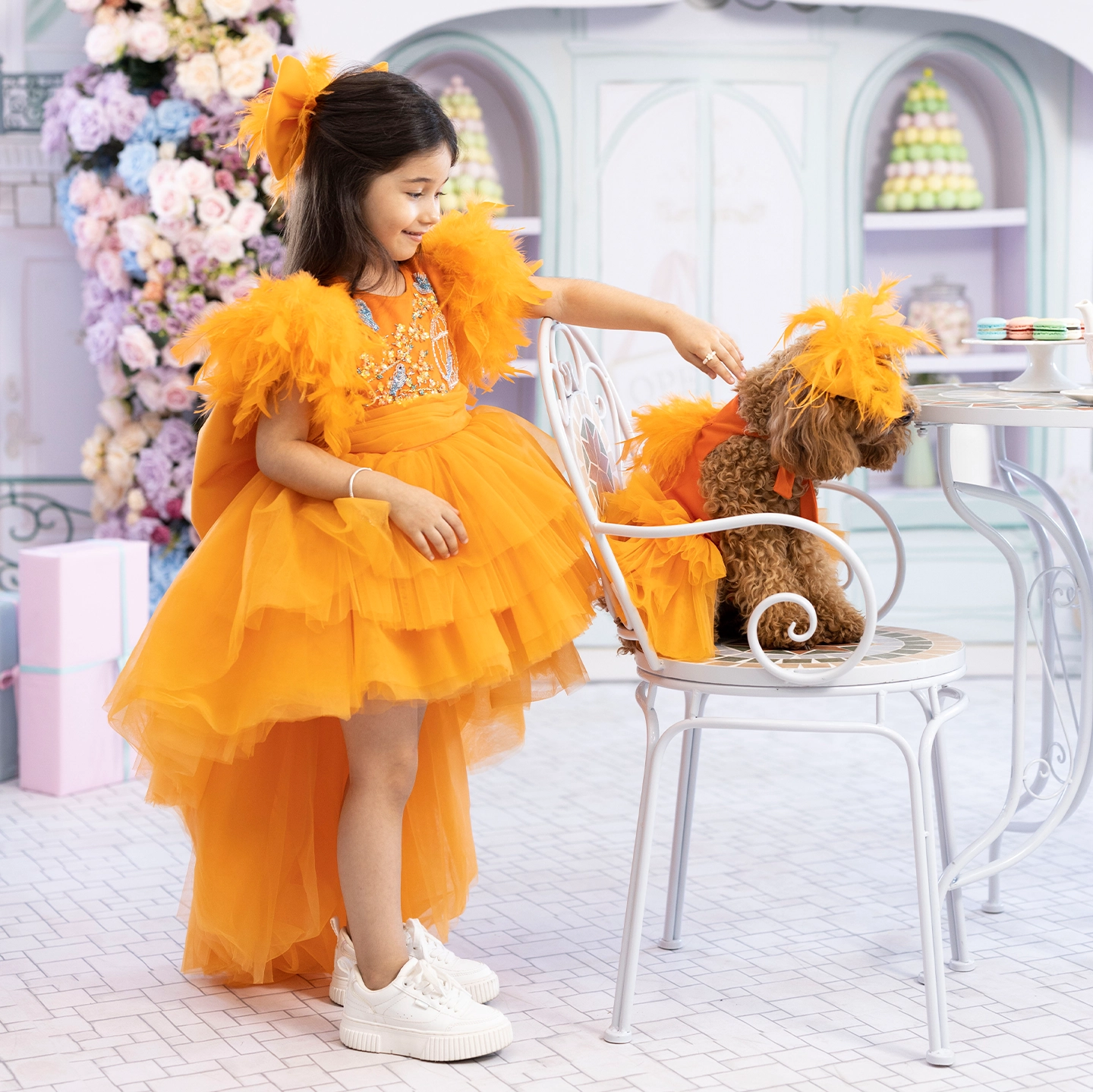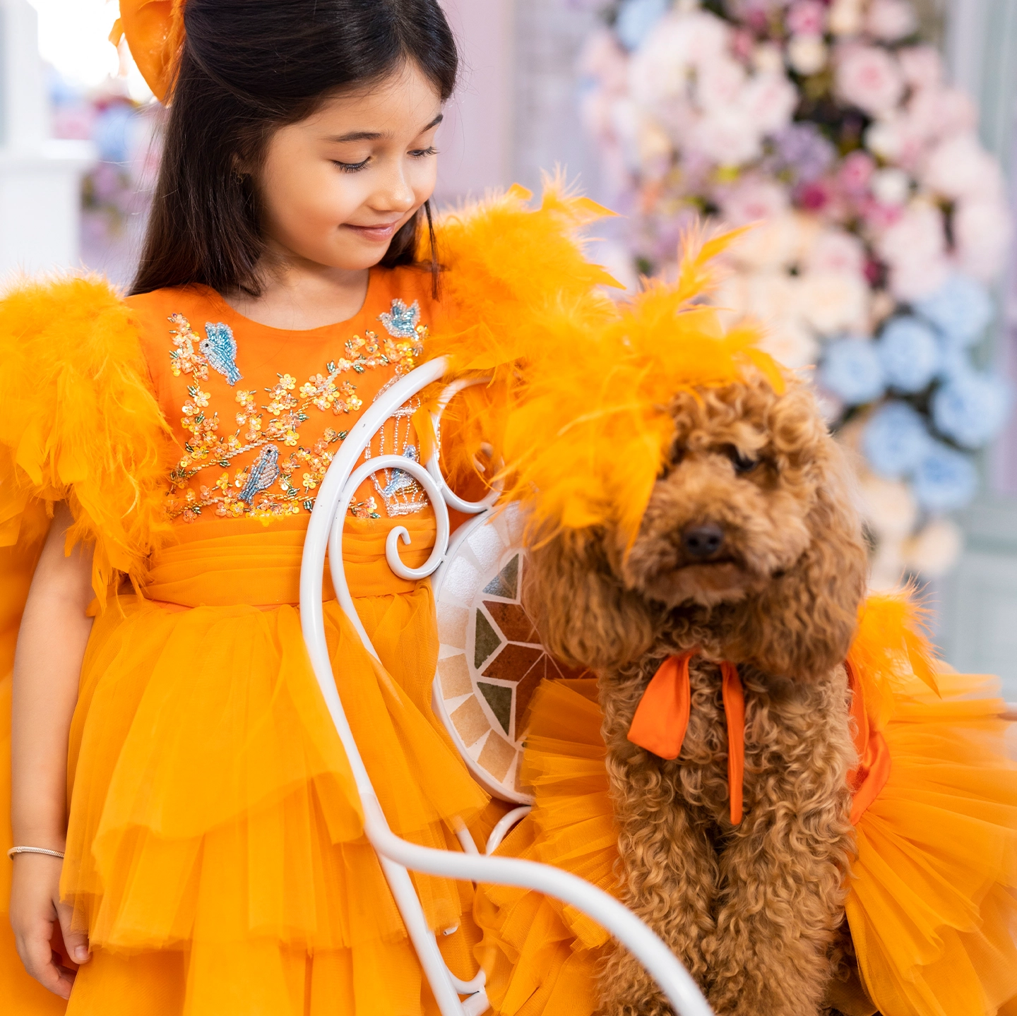 Önü kısa arkası uzun tasarlanan turuncu elbise, kat kat %100 ipek tül ile hacim kazanır. Üst bedende mavi kuşlar ve çiçekli kafesler, İtalyan kristalleri ve gerçek Swarovski taşlarla işlendi. Kollarda gerçek kuş tüyleri kullanıldı. İç astar %100 pamuk, alt etek ise formunu koruyan yırtılmaz tül ile güçlendirildi.