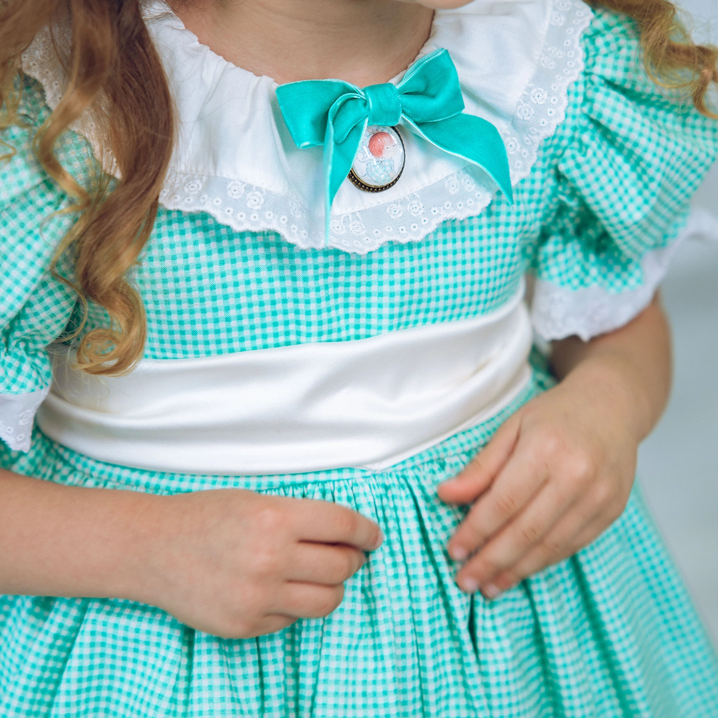 İthal pamuk pötikare kumaşla hazırlanan model, beldeki ipek fiyonk ve takılabilir broş detayıyla zarif bir dokunuş kazanır.